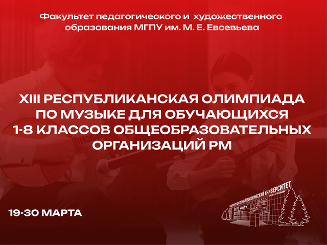 Факультет педагогического и художественного образования Мордовского государственного педагогического университета имени М. Е. Евсевьева приглашает к участию в XIII Республиканской олимпиаде по музыке для обучающихся 1-8 классов общеобразовательных организаций РМ, посвященной Году единства народов России, которая пройдет 19-30 марта 2026 года. Цель: актуализация знаний в предметной области «Музыка» и выявление уровня ко...